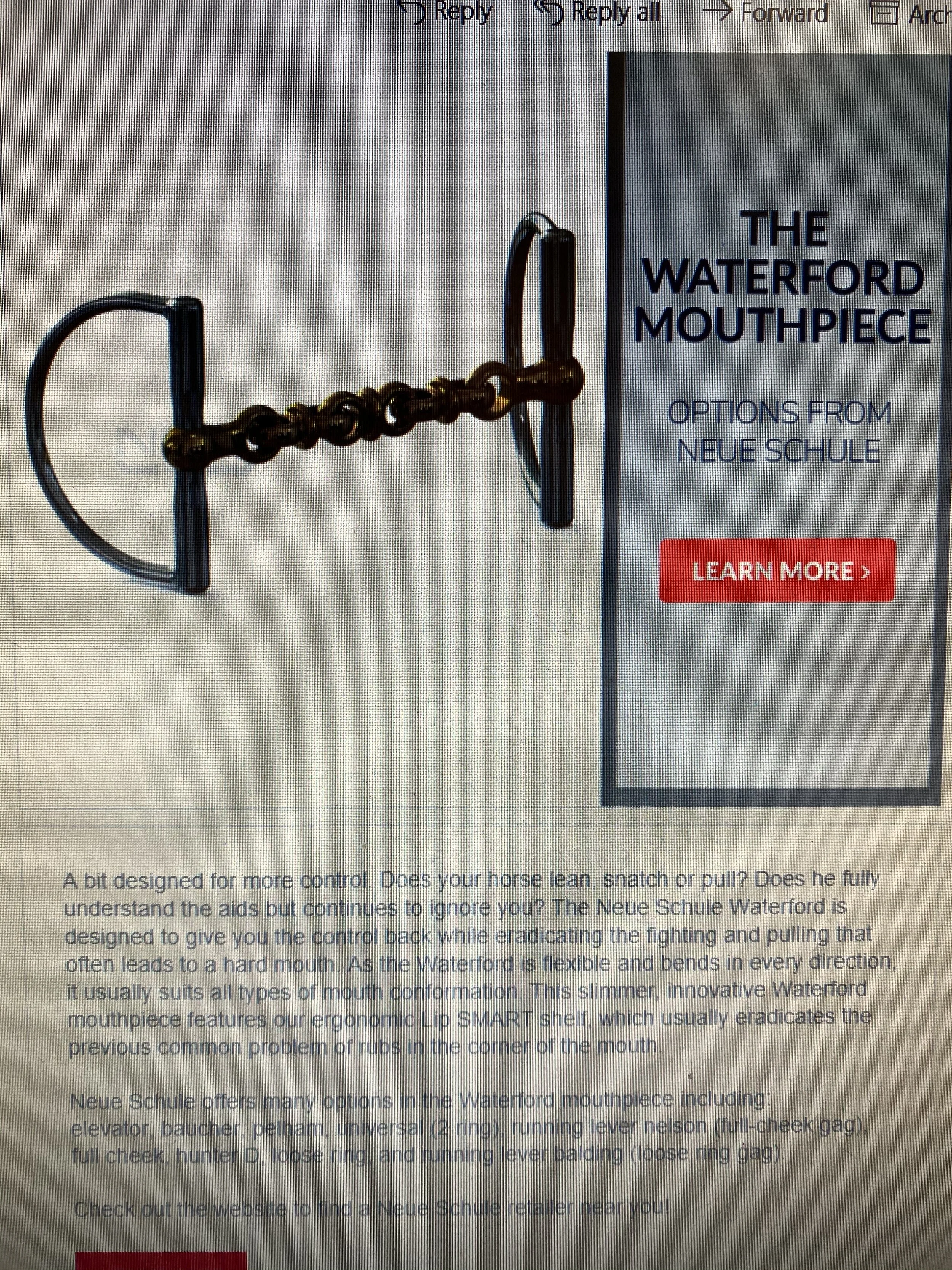 I actually recently recorded a video series on contact which I will post in the coming days that will shed some light into what actually goes on with most dressage riders’ contact and how that affects your horse. Without classical, clear, structured examples and education, people fall for the “easy fix“ of a bit like the one described in the ad. But, of course, we know how this ends, how it always ends, with a horse in distress with no options, living in learned helplessness for the rest of his useful days.
